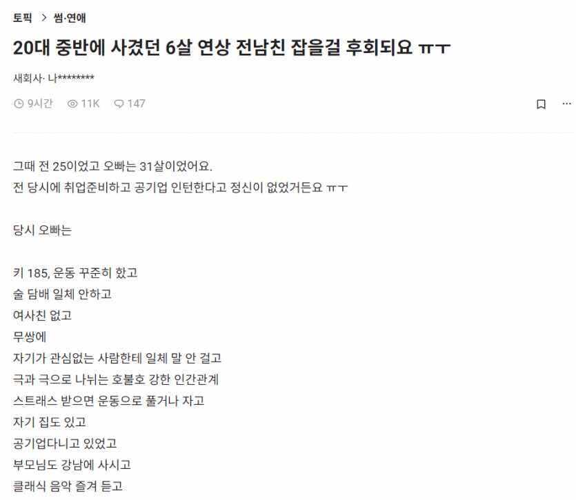 공유 링크 만들기 Facebook X Pinterest 이메일 기타 앱 20대 중반에 사겼던 6살 연상 전남친 잡을 걸 후회돼요 ㅠㅜ 여자의 가치는 나이가 들수록 점점 떨어진다. 공유 링크 만들기 Facebook X Pinterest 이메일 기타 앱 댓글