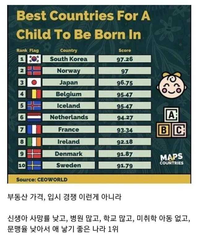 공유 링크 만들기 Facebook X Pinterest 이메일 기타 앱 애 낳기 좋은 나라 Top 10 낳기에 좋고 키우기에 힘든 나라 공유 링크 만들기 Facebook X Pinterest 이메일 기타 앱 댓글