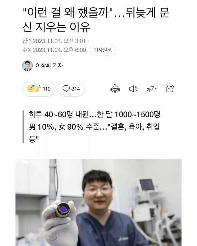 공유 링크 만들기 Facebook X Pinterest 이메일 기타 앱 여성들이 문신을 다시 지우는 이유 환자비율은 남성 10%, 여성 90% 한달 방문자 1000~1500명.. 지우는 사유는 결혼 , 취업, 육아 등.. 공유 링크 만들기 Facebook X Pinterest 이메일 기타 앱 댓글